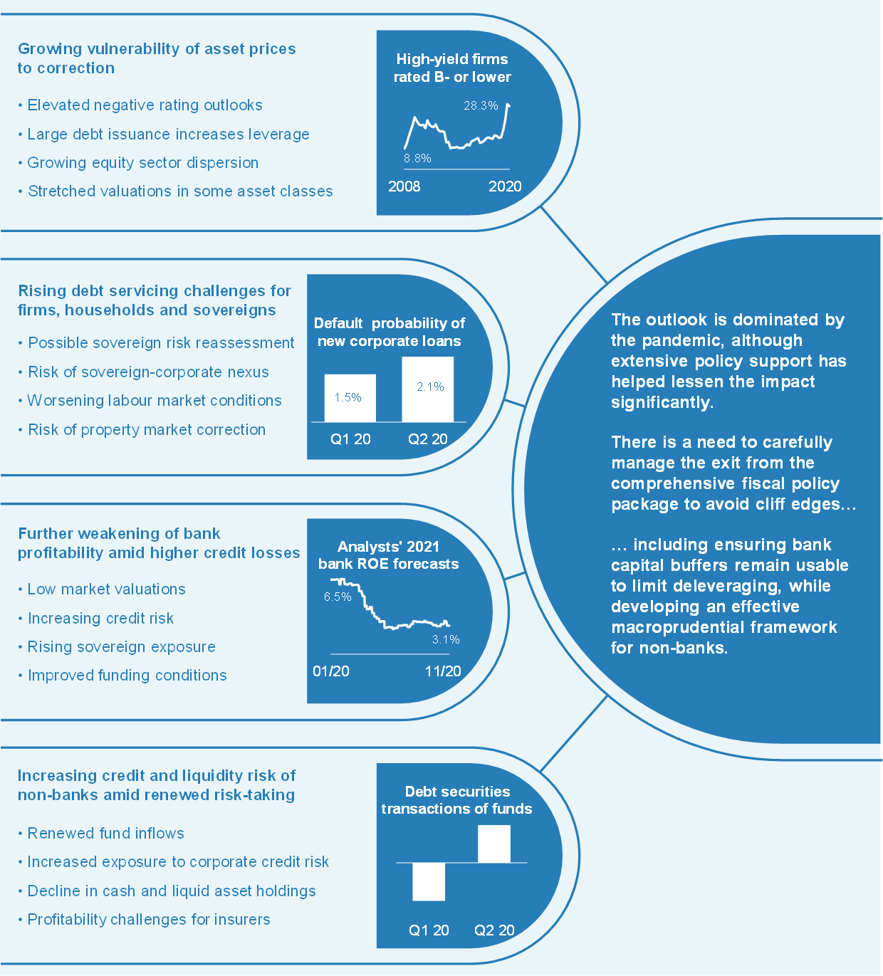 The importance of policy measures in containing the economic and financial stability impact of the pandemic makes managing the exit from this support equally important. Economic and financial sector policy measures have so far limited the materialisation of credit risk and adverse feedback loops between the real economy and the financial system. A continued, powerful and targeted policy response is vital to protect the economy, until the pandemic passes. Even then, risks for households and firms facing a cliff edge from the withdrawal of policy support must be balanced against the risks related to prolonged support (e.g. possible misallocation of capital, postponed loss recognition, etc.). Looking ahead, medium-term vulnerabilities for euro area financial stability have remained elevated and relate to: (i) a mispricing of some asset classes and possible corrections in markets; (ii) growing fragilities in the non-financial private and public sectors; (iii) weaker bank profitability in the light of lower interest rates and expected higher credit losses; and (iv) renewed risk-taking by non-banks, in particular investment funds. The potential for these vulnerabilities to materialise simultaneously and possibly amplify each other further increases the risks to financial stability.
