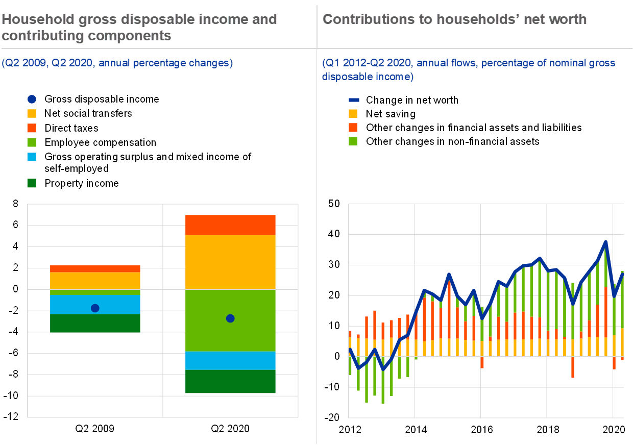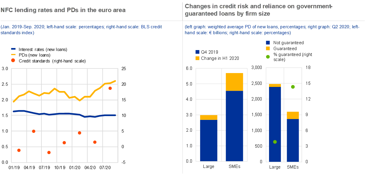 Governmental support to firms has preserved production capacity so far, but this could be challenged if the economic situation deteriorates further. Loan guarantees, loan moratoria, tax deferrals and direct transfers have alleviated immediate liquidity constraints for many companies, containing insolvencies during the first wave of the pandemic in spring. In labour markets, companies reduced labour input by cutting hours instead of laying off employees which was supported by short-time work schemes (see Chart 1.2, right panel). This adjustment mostly along the intensive margin (i.e. average hours worked) is mirrored by a more limited increase in unemployment compared with the global financial crisis (GFC) so far, even though total employment declined more than in the first half of 2009 due to substantial flows to inactivity. At the same time, these liquidity-providing support measures may become less effective if the economic situation deteriorates further and liquidity constraints morph into solvency issues.