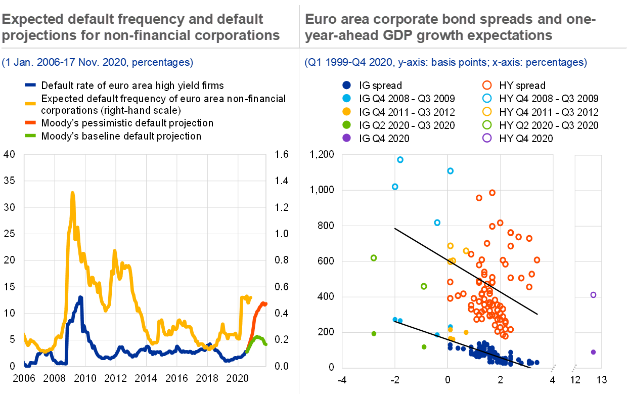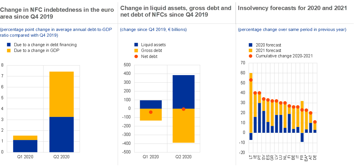 A premature withdrawal of policy support and a protracted pandemic could prolong the recession and have permanent scarring effects. While policy support will need to be withdrawn eventually, an abrupt end to the ongoing measures could give rise to cliff effects and result in a more severe economic contraction than during the first wave of the pandemic. In addition, the spread as well as the eventual duration of the pandemic remain highly uncertain, with the tail risk of a prolonged period of social distancing measures. In particular firms that are most affected by social distancing may therefore face severe solvency issues or a more permanent disruption to their business models, the longer the pandemic lasts, even as the rest of the economy recovers. This risk is exacerbated by the already high leverage of many corporates, households and sovereigns following the first wave of the pandemic (see the remainder of Chapter 1).