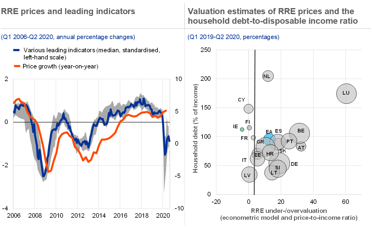 The risk of correction in tangible asset markets – namely residential and commercial property markets – has also increased. Euro area residential real estate markets have proved resilient to the pandemic so far, as the low interest rate environment has continued to underpin demand, while loan moratoria and job protection schemes have helped to sustain household debt servicing capacity. Even so, signs of overvaluation are increasingly visible for the euro area as a whole (see Chart 3, right panel). By contrast, the pandemic has led to an abrupt and sustained drop in activity in commercial real estate (CRE) markets, with a disproportionate drop in activity by more flighty foreign investors. A longer than expected economic shock, coupled with preference shifts arising from the pandemic (e.g. lower demand for office space), could prompt an extended decline in the euro area CRE market.