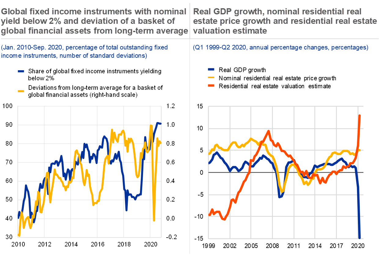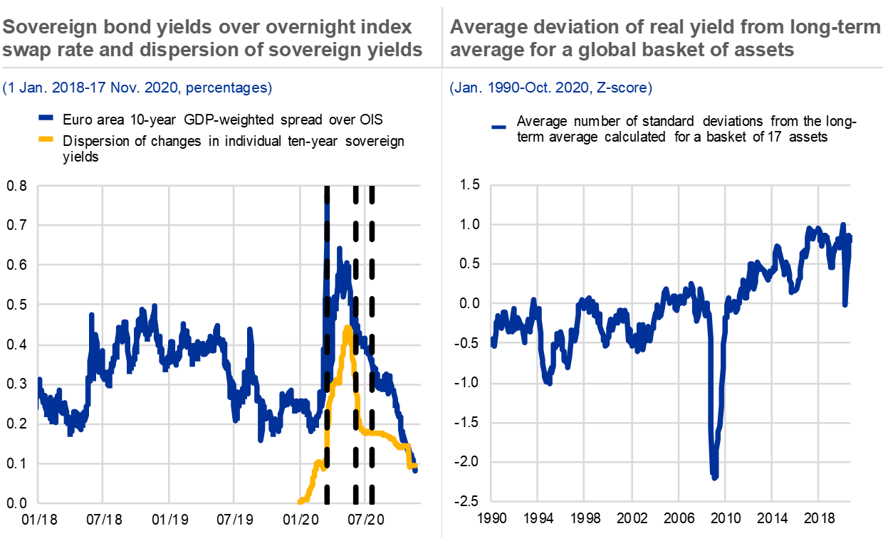 A notable rebound in financial markets over the summer has contrasted with weak economic fundamentals – increasing the risk of a correction. There was a remarkable recovery in financial asset prices over the summer, reflecting historically loose financial conditions and confidence in the monetary and fiscal policy response. In particular, the buoyancy of some equity markets has led to some concern about a disconnect from underlying economic fundamentals. That said, advances in equity markets have varied across both countries and sectors, with the largest rebounds concentrated in the United States and the technology sector (see Chart 2, right panel), reflecting a large dispersion of sectoral earnings expectations (see Chapter 2). Credit spreads have fallen back to pre-pandemic levels across the rating spectrum and appear tight in view of the near-term economic outlook, particularly for the high-yield segment of the corporate bond market. Globally, rising asset prices have resulted in 90% of outstanding fixed income securities offering nominal yields of 2% or less and the average real yield of a basket of 17 global financial assets stands at 0.8 standard deviations away from its long-term average (see Chart 3, left panel). Taken together, equity and credit valuations seem increasingly contingent on, and sensitive to, changes in the benchmark yield curve, and investors could reassess asset valuations swiftly if the course of the pandemic were to lead to materially weaker economic outcomes.