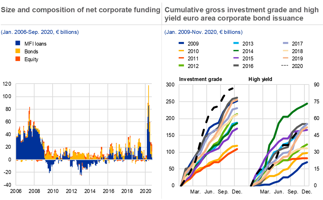 Favourable financing conditions and supranational support schemes alleviate near-term debt sustainability concerns. The availability and cost of funding have improved across sectors since the end of March on the back of large-scale monetary policy support, while the provisional agreement on the EU recovery fund in July has also helped stem the re-emergence of fragmentation in euro area sovereign bond markets. In the year to date, euro area governments have issued more than €1 trillion of debt on a net basis (see Chart 5, right panel) to finance a range of support schemes. But a large part of this new debt has been issued at the short end of the maturity spectrum, which increases near-term rollover risks. Similarly, euro area investment-grade firms issued record amounts in corporate bond markets in 2020, and high-yield companies’ debt issuance has rebounded markedly in recent months.