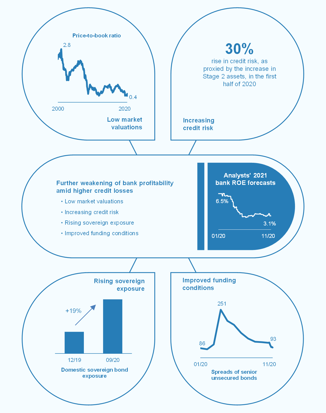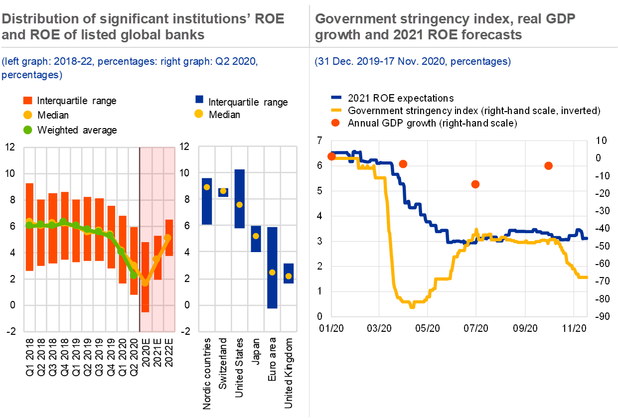 Despite the increased resilience of euro area banks since the global financial crisis, weak profitability prospects continue to weigh on bank valuations. The first half of 2020 saw a marked decline in euro area banks’ return on equity (ROE), from over 5% in the fourth quarter of 2019 to just above 2% in the second quarter of 2020. This change was driven predominantly by higher loan loss provisions and banks’ impaired income-generation capacity as a result of the economic fallout from the pandemic. Cost reductions have only partially offset this (see Chart 7, left panel). Looking ahead, bank profitability is expected to remain weak and to recover only very gradually to levels seen before the outbreak of the pandemic. Market analysts have revised down their ROE forecasts for euro area banks on account of higher expected credit losses. This weak profitability outlook is also reflected in historically low bank valuations (see Chapter 3).