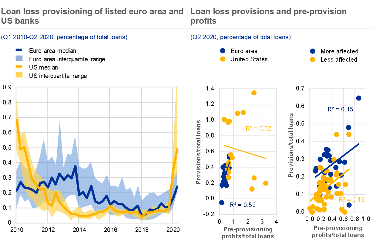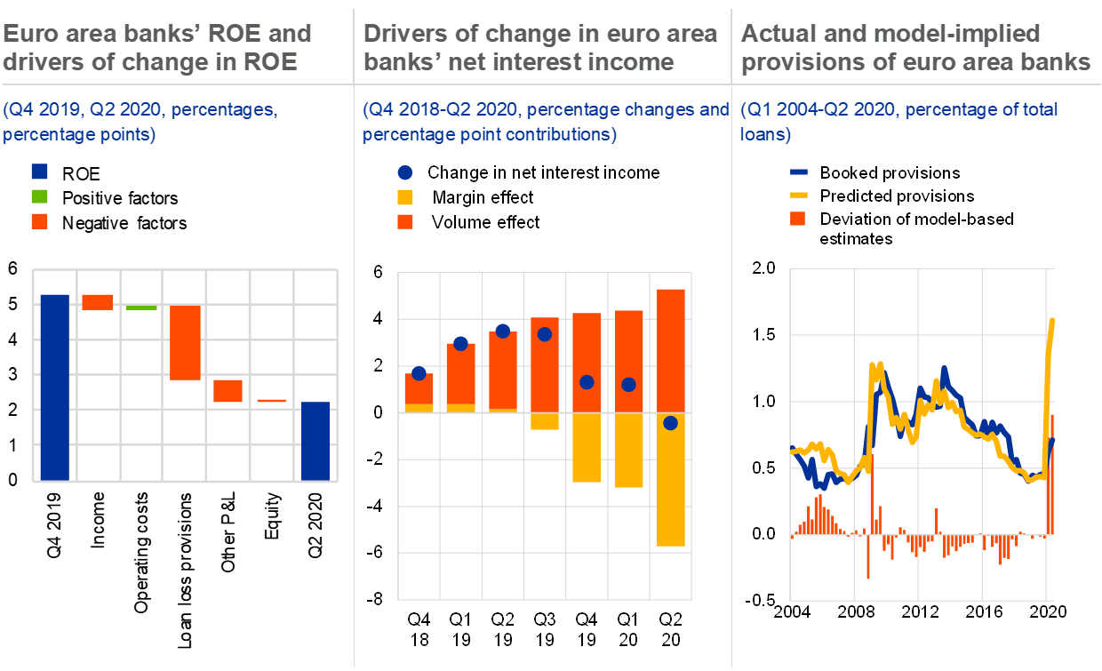 Notes: Left panel: the return on equity figure for the second quarter of 2020 depends on the way net income is annualised. In the FSR, the four-quarter average of total equity is used in the denominator, while net income is annualised using four-quarter trailing sums. ECB Banking Supervision annualises quarterly/semi-annual data by multiplying it by four/two respectively, resulting in a different headline profitability figure. Right panel: the decomposition is based on a bank-level panel model for the provisions-to-total loans ratio. The explanatory variables and estimated signs (in brackets) are as follows: asset quality factors: non-performing assets ratio (+), annual change in non-performing assets ratio (+) and reserves/non-performing assets (+), pre-provision return on assets (+), loans/total assets (+), log of total assets (+); macro factors: output gap (-) and annual real GDP growth (-), year fixed effects, country fixed effects. The model does not include the impact of policy support measures. The model is estimated on a quarterly unbalanced panel covering around 60 euro area banks between the first quarter of 2000 and the second quarter of 2020.The in-sample fit of the model is fairly good with an adjusted R-squared of around 55%. The estimated year fixed effect for 2020 is highly negative at -1.22% and statistically significant at the 1% confidence level.
