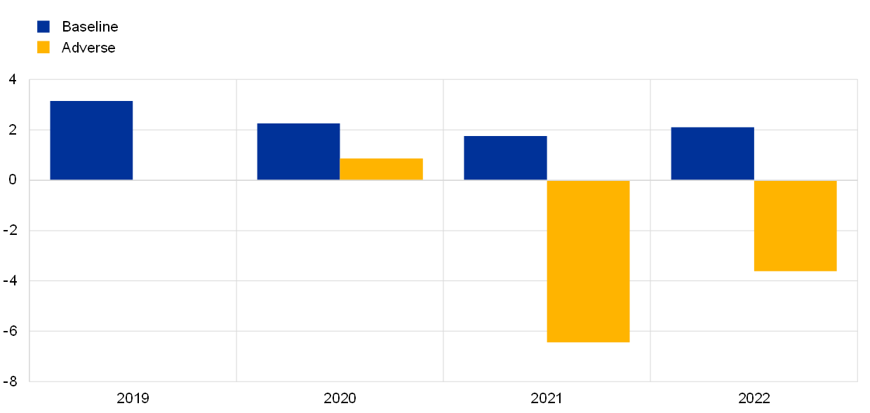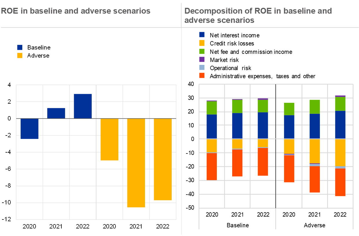 33. Both baseline and adverse scenarios assume conservatively that banks will remain reluctant to use their capital buffers in support of lending. Under both scenarios, banks’ readiness to dip into their capital buffers would be reflected in higher lending dynamics with benefits for the economy and without any noticeable negative effect on their capital position. See Enria, A., “The coronavirus crisis and ECB Banking Supervision: taking stock and looking ahead”, The Supervision Blog, ECB, 28 July 2020, in Borsuk, M., Budnik, K. and Volk, M., “Buffer use and lending impact”, Macroprudential Bulletin, Issue 11, ECB, October 2020.