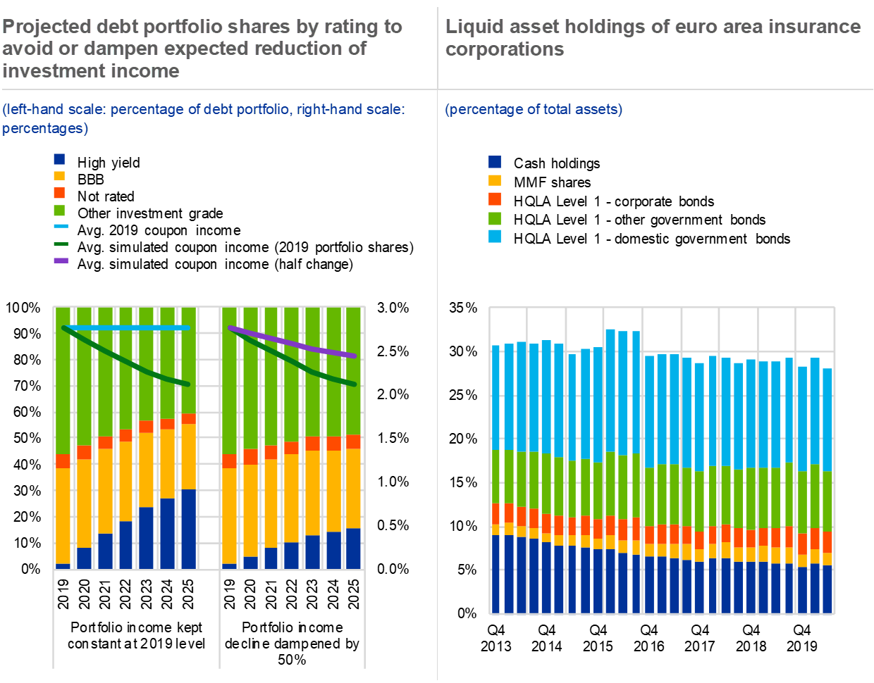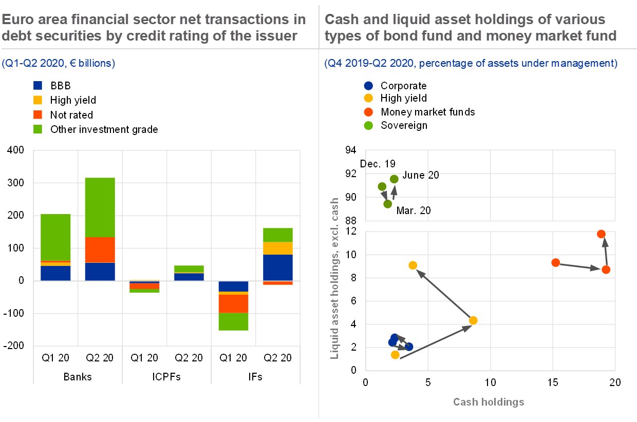 Notes: Left panel: the chart covers all debt securities purchased or sold by euro area banks, insurers, pension funds and investment funds, including those issued by financial and non-financial corporations as well as sovereigns, in the euro area and globally. ICPFs: insurance corporations and pension funds; IFs: investment funds. Right panel: liquid holdings comprise Level 1 high-quality liquid assets (the concept from Basel III banking regulation) consisting of euro-denominated bonds issued by EU governments and non-euro-denominated bonds issued by foreign governments, rated at least AA. Data refer to euro area-domiciled bond funds and money market funds only. High-yield bond funds refer to euro area-domiciled funds which primarily invest in high-yield bonds. This sample is distinct from the corporate bond fund sample, which has a broader investment focus.