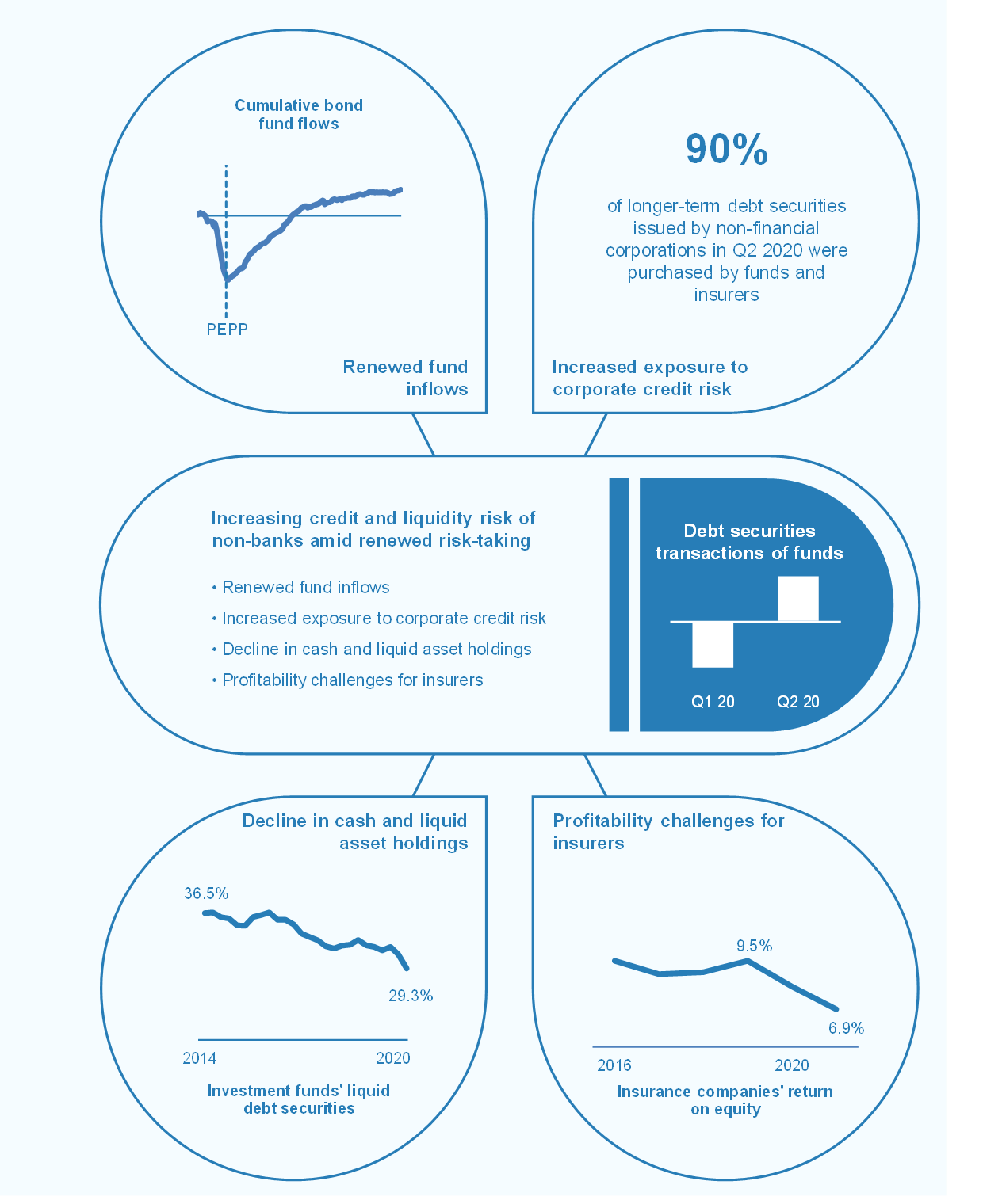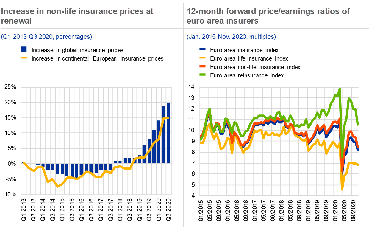 Non-bank financial intermediaries appear to have increased their risk-taking (see Chart 4, left panel). The non-bank financial sector continued to provide significant financing for firms after the initial coronavirus shock. However, following a return of inflows in recent months, euro area investment funds have increased their longer-duration and lower-rated non-financial corporate (NFC) debt exposures, increasing the likelihood of outflows and losses if corporate credit risk rises materially. After a temporary increase in cash positions following the March turmoil and despite significant inflows, cash holdings of corporate bond funds have reverted to previous levels (see Chart 4, right panel). Bond funds have increased the share of liquid bonds in their portfolios, but the fund sector as a whole has ventured further into less liquid assets. This leaves funds vulnerable to large outflows in the event of possible future turmoil. While insurers’ aggregate liquidity positions appear stable, cash needs, for example arising from margin calls, might rise if the risk of renewed market volatility were to materialise. Profitability pressures arising from lower underwriting volumes and higher claim provisions stemming from both the pandemic and a relatively large number of natural catastrophes in 2020 could induce insurers to further rebalance their portfolios towards higher-yielding, but riskier assets.