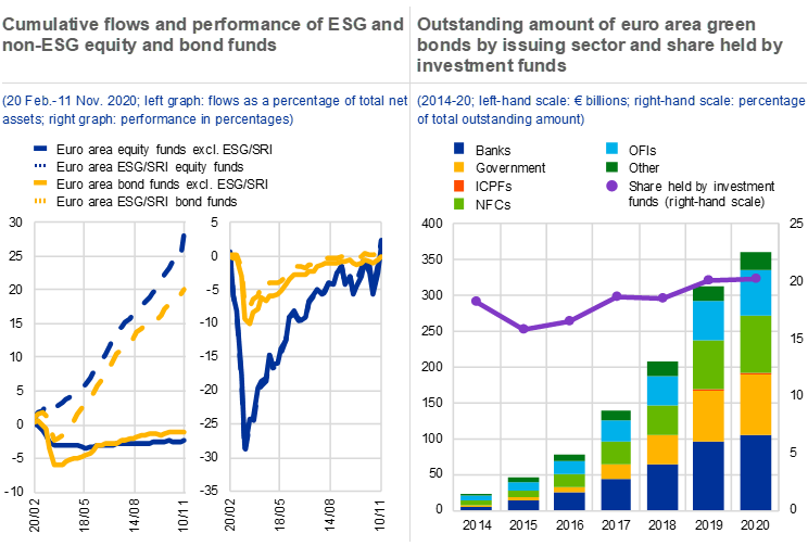 46. Non-ESG bond funds include sovereign, high-yield and investment-grade corporate bond funds, and other mixed bond funds. The difference in the sample explains why flows into non-ESG bond funds are lower than flows into sovereign, high-yield and investment-grade corporate bond funds separately in Chart 4.3 (left panel).