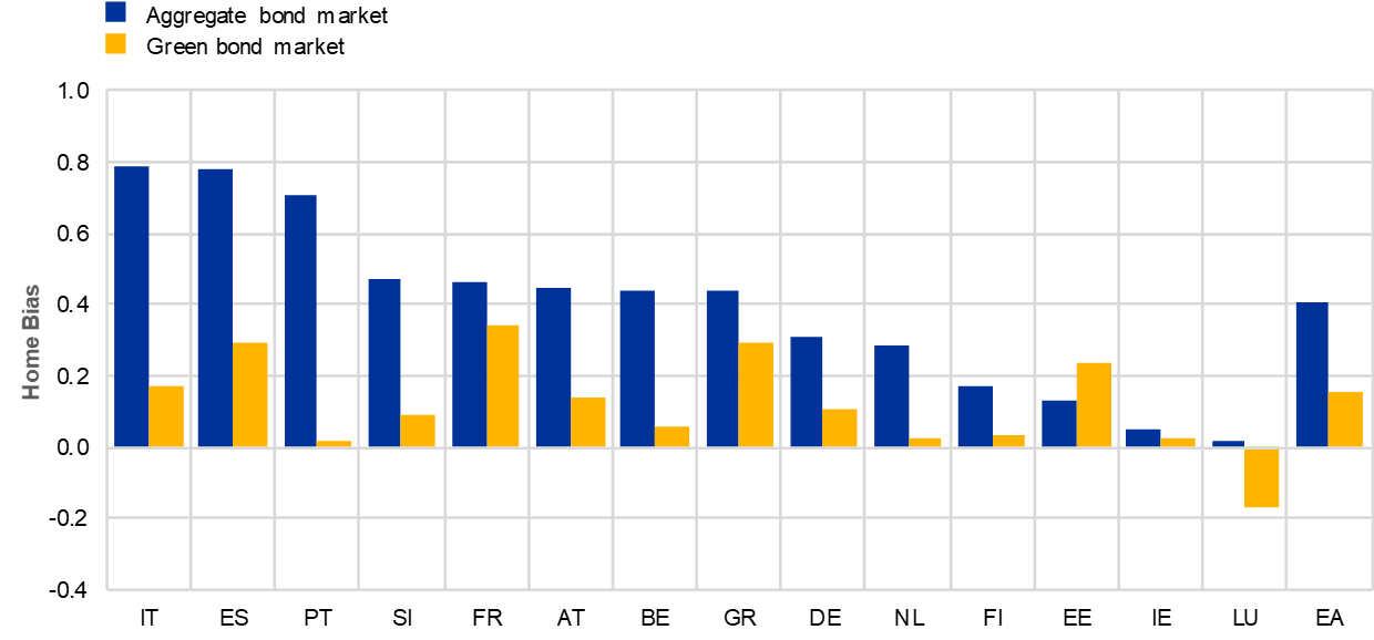 79. This bar chart is an early product of ongoing research into home bias and key characteristics of the green bond market by David Cesar Heymann, Anouk Levels, Claudia Lambert and Michael Wedow. David Cesar Heymann, Claudia Lambert and Michael Wedow are affiliated with the ECB, while Anouk Levels is affiliated with De Nederlandsche Bank.