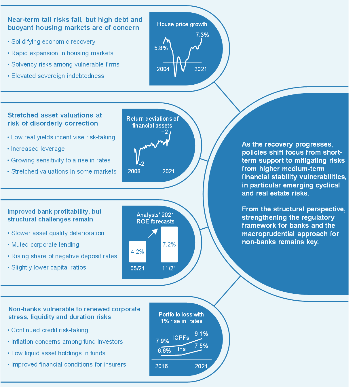 Recent months have seen attention shift from near-term financial stability risks associated with the pandemic to increasing medium-term vulnerabilities. Improved economic conditions have contributed to a decline in near-term vulnerabilities for sovereigns, corporates and banks, even if heterogeneity at the country and sector levels remains. Vulnerabilities from mispricing in some financial and tangible asset markets have increased, however, amid continued risk-taking by non-bank financial institutions. Moreover, the pandemic has left a legacy of significantly higher levels of indebtedness across sectors. These vulnerabilities could unravel in a disorderly manner through shocks such as: (i) an abrupt change in market expectations regarding the pace of monetary policy normalisation; (ii) a premature withdrawal of government support to non-financial sectors; or (iii) a re-intensification of the spread of the coronavirus. The potential for these vulnerabilities to materialise simultaneously and to possibly amplify each other further increases the medium-term risks to financial stability.
