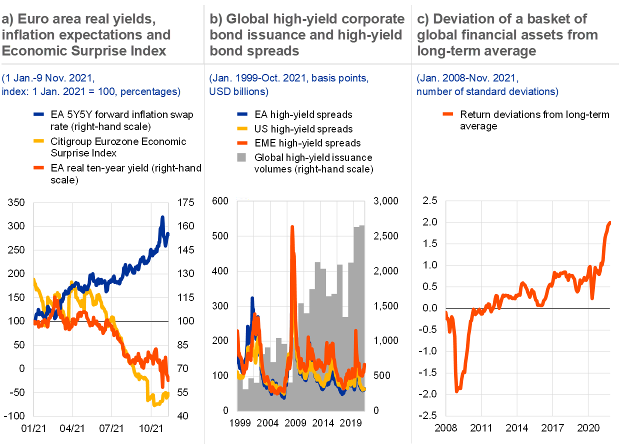 Notes: Panel a: “EA 5Y5Y forward inflation swap rate” refers to the euro area five-year forward inflation-linked swap rate five years ahead. Panel b: government option-adjusted spreads are employed. Panel c: the basket of global financial assets used to compute the valuation metric includes: real yields on euro area, Japanese, UK and US ten-year government bonds; euro area and US investment-grade and high-yield bonds; euro area, Japanese, UK and US equity; US real estate investment trusts and mortgage-backed securities; and emerging market sovereigns and equity. EA: euro area.