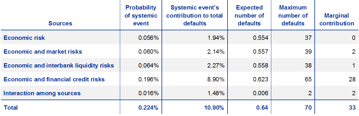 Financial amplification mechanisms appear sizeable in the euro area financial system, and could make a significant contribution to the probability of experiencing a systemic event. Moreover, as shown in Table B.2, a consistent share of the total number of defaults across all scenarios, almost 11%, is explained by the tail of the distribution, that is, by the realisation of systemic events. Interaction among contagion channels accounts for approximately 1.5% of total defaults in the tail of the distribution. Notably, the average probability of an individual bank default seems to be most affected by economic risk, and the other contagion channels only slightly affect the mean of the distribution.