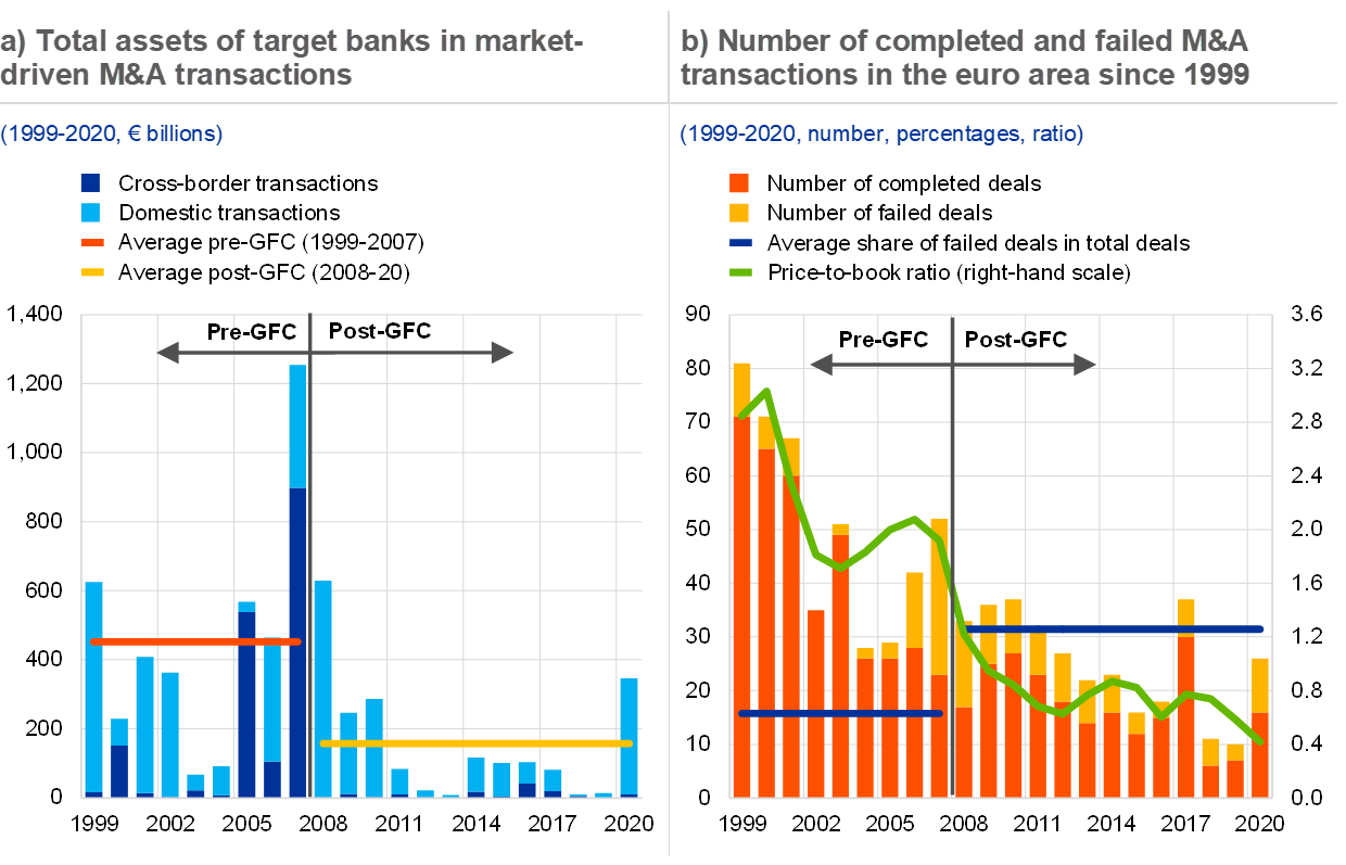 Notes: Relevant M&A transactions exclude the acquisition of assets, repurchases, privatisations, leveraged buyouts, joint ventures and restructurings. They meet the following criteria: (1) the acquired stake is above 10%, corresponding to a qualifying holding; (2) the initial stake is below or equal to 50%; and (3) the final stake is above 50%. In cases where multiple banks are involved in a deal as target and/or acquirer, at least one of the targets and/or acquirers have to be domiciled within the euro area. The transactions are reported by the year in which they were announced. The periods before and after the global financial crisis (GFC) are defined as 1999-2007 and 2008-20 respectively. Panel a: total assets refer to the last available observation prior to the year in which the merger was completed. Data on total assets of the target are available for 350 out of 603 deals reported by Dealogic for 1999-2020. Panel b: the price-to-book ratio shown refers to the median of listed euro area banks’ price-to-book ratios at the end of each year.