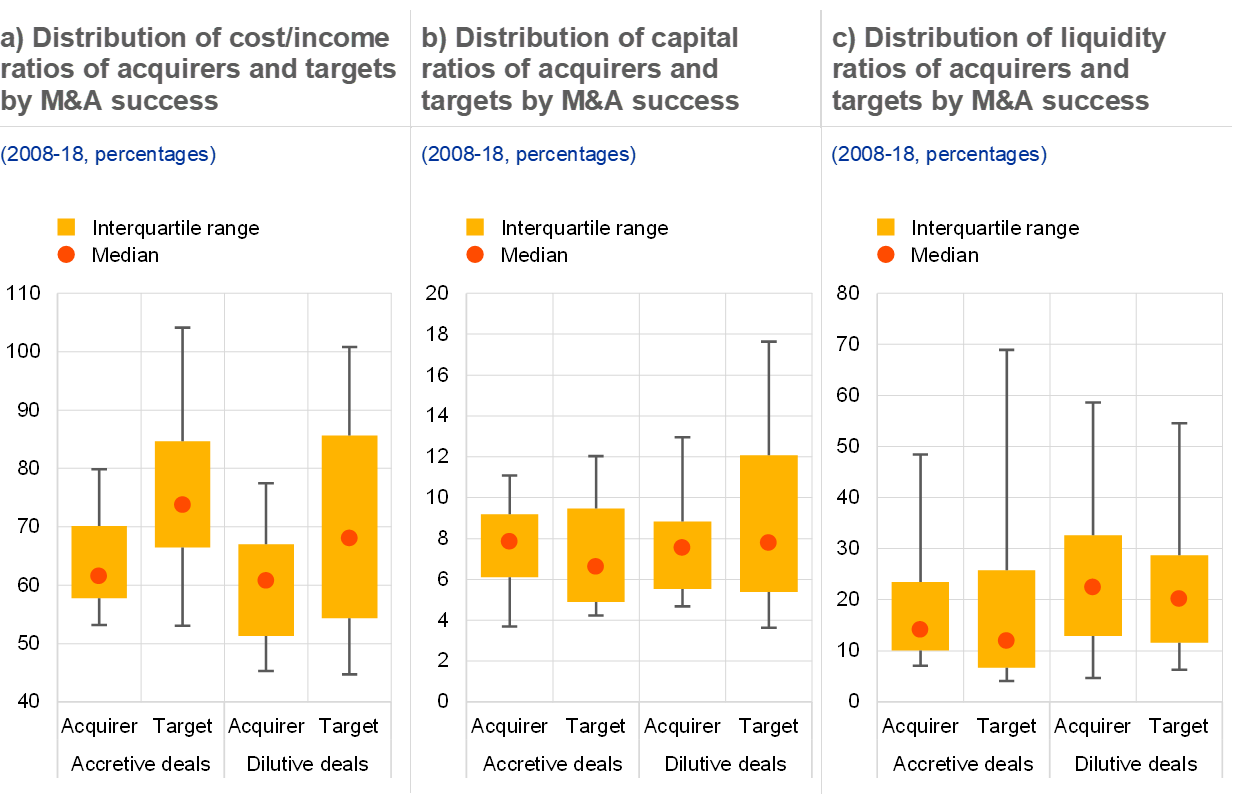 Note: Accretive deals are classified as those which resulted in an increase in the ROE of the merged bank over a two-year horizon after the M&A transaction, relative to weighted average ROE, after accounting for the change in the aggregate ROE of the sector. The remaining deals are classified as dilutive. Horizontal lines on the whiskers denote the range between the 10th and the 90th percentile of the distribution.