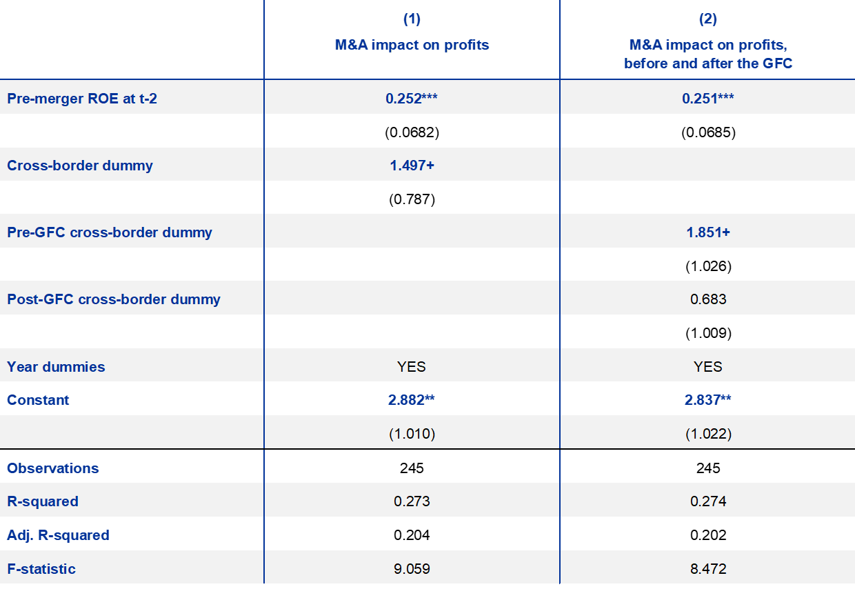 Notes: Standard errors in parentheses. Significance levels: + p<0.10, * p<0.05, ** p<0.01, *** p<0.001. In line with Beccalli and Frantz (see footnote 16), constants and dummies are interpreted as the average change in ROE following an M&A transaction. GFC: global financial crisis (see notes to Chart B.2).