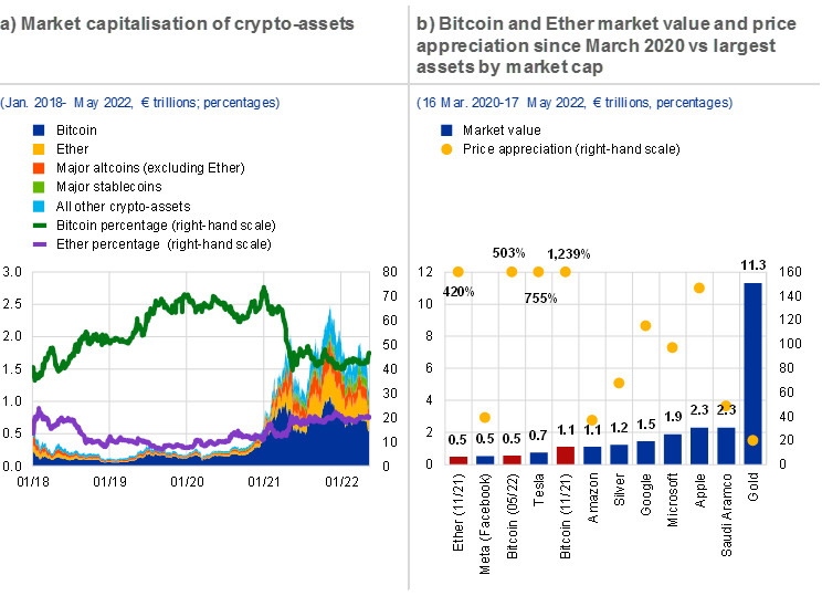 Risks to financial stability in the euro area stemming from crypto-assets were seen as limited in the past.[3] This special feature provides an update on crypto-asset market developments and a general overview of risks stemming from unbacked crypto-assets and DeFi, given the way in which they have evolved and their specific characteristics and risks. This article therefore abstracts from a specific discussion on risks and developments in stablecoins which, as shown by the recent TerraUSD crash and Tether de-peg, are not as stable as their name suggests and cannot guarantee their peg at all times.[4] Following a deep dive into crypto-asset leverage and crypto lending, we conclude that if the present trajectory of growth in the size and complexity of the crypto-asset ecosystem continues, and if financial institutions become increasingly involved with crypto-assets, then crypto-assets will pose a risk to financial stability.