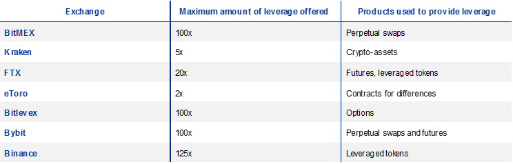 Financial stability risks could be amplified by the growing options offered by crypto exchanges for investors to increase their exposure through leverage. Products such as leveraged tokens,[13] futures contracts and options can allow investors to synthetically increase their exposure to crypto-asset returns (and risk). Some crypto exchanges offer ways to increase exposures by as much as 125 times the initial investment (Table B.1). However, the total volumes of leveraged contracts in crypto-asset markets and the extent to which leverage is actually used on these trading platforms are generally not reported. Furthermore, some investors use borrowed funds to purchase their exposure (margin trading), thus increasing the risks to financial stability.