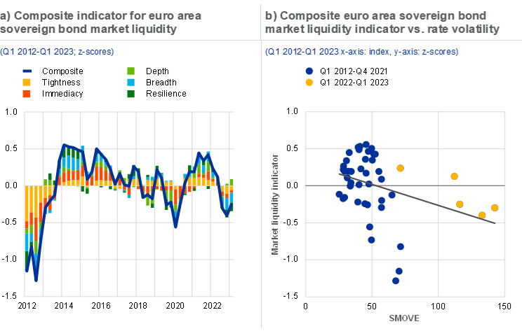 Notes: Panel a: composite liquidity indicator based on number of market-makers, share of non-quoted or non-traded securities, transaction frequency, trade size, dealer inventory, quote slope, quoted volume, traded volume, turnover ratio, Amihud ratio, effective spread, spread dispersion, volume concentration, market efficiency coefficient and Bloomberg Liquidity Index. Panel b: the chart shows the OLS fit between the SMOVE and the composite indicator for euro area sovereign bond market liquidity between Q1 2012 and Q1 2023. SMOVE is the Merrill Lynch 1M EUR Swaption Volatility Estimate Index.