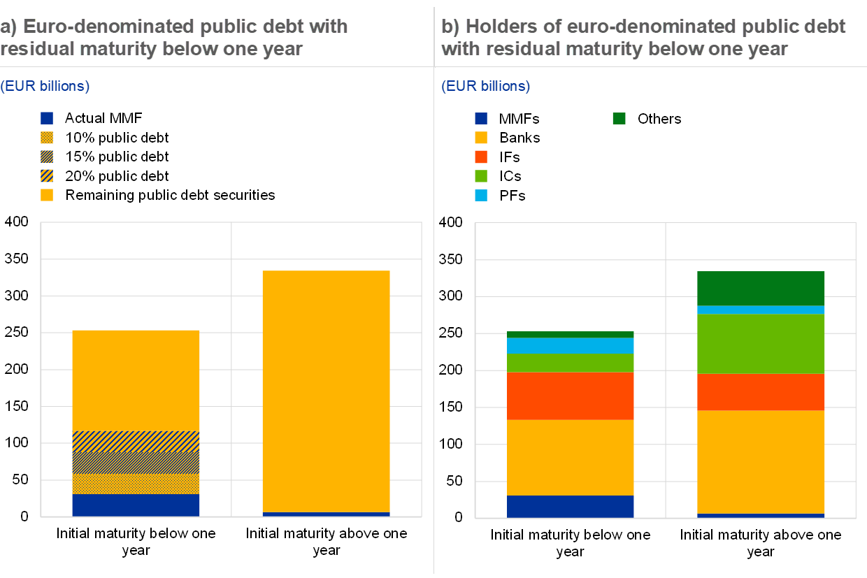 Notes: Panel a shows MMF holdings of euro area government debt (euro-denominated) with a residual maturity below one year and an investment grade rating. The shaded part of the left bar shows the additional public debt that euro-denominated MMFs would hold under different quotas (10%, 15% or 20%). To compute the prospective holdings, we calculate the total size of the euro-denominated sector using a combination of Banque de France and Lipper data. Panel b shows which sectors currently hold these public debt securities. IFs = investment funds; ICs = insurance corporations; PFs = pension funds.