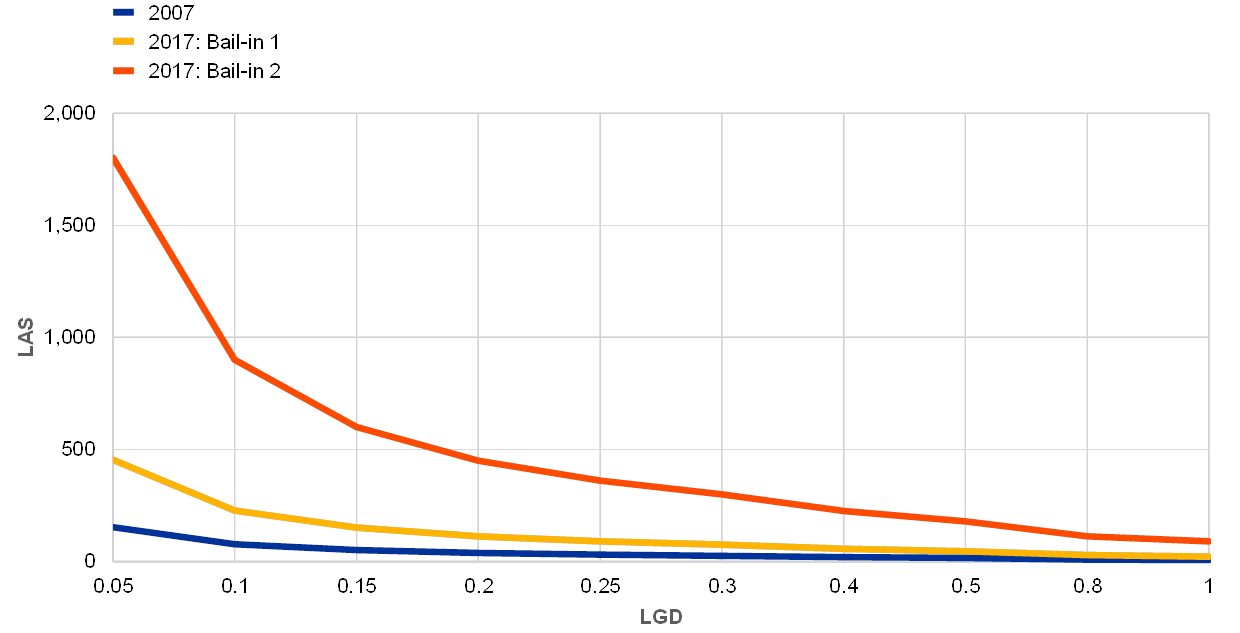 Figure 5 plots the average loss-absorbing score (LAS, equal to SLAC over simulated losses; eq. 3) across all banks and simulations for a range of LGD values for 2007 and 2017 under the two different bail-in options. When considering only MREL-eligible bonds (bail-in option 1), the LAS score has increased approximately 3.5-fold in the last ten years. When considering all bail-inable liabilities (bail-in option 2), the LAS score has increased almost twelvefold. The results are quite homogeneous across all LGD values.