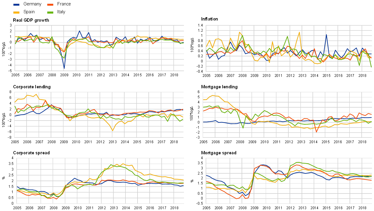 Notes: Real GDP growth, inflation and corporate and mortgage lending are computed as the log difference of the respective variable multiplied by 100. The corporate and mortgage spreads are defined in percentages. The sample spans the period from the first quarter of 2005 to the fourth quarter of 2018.