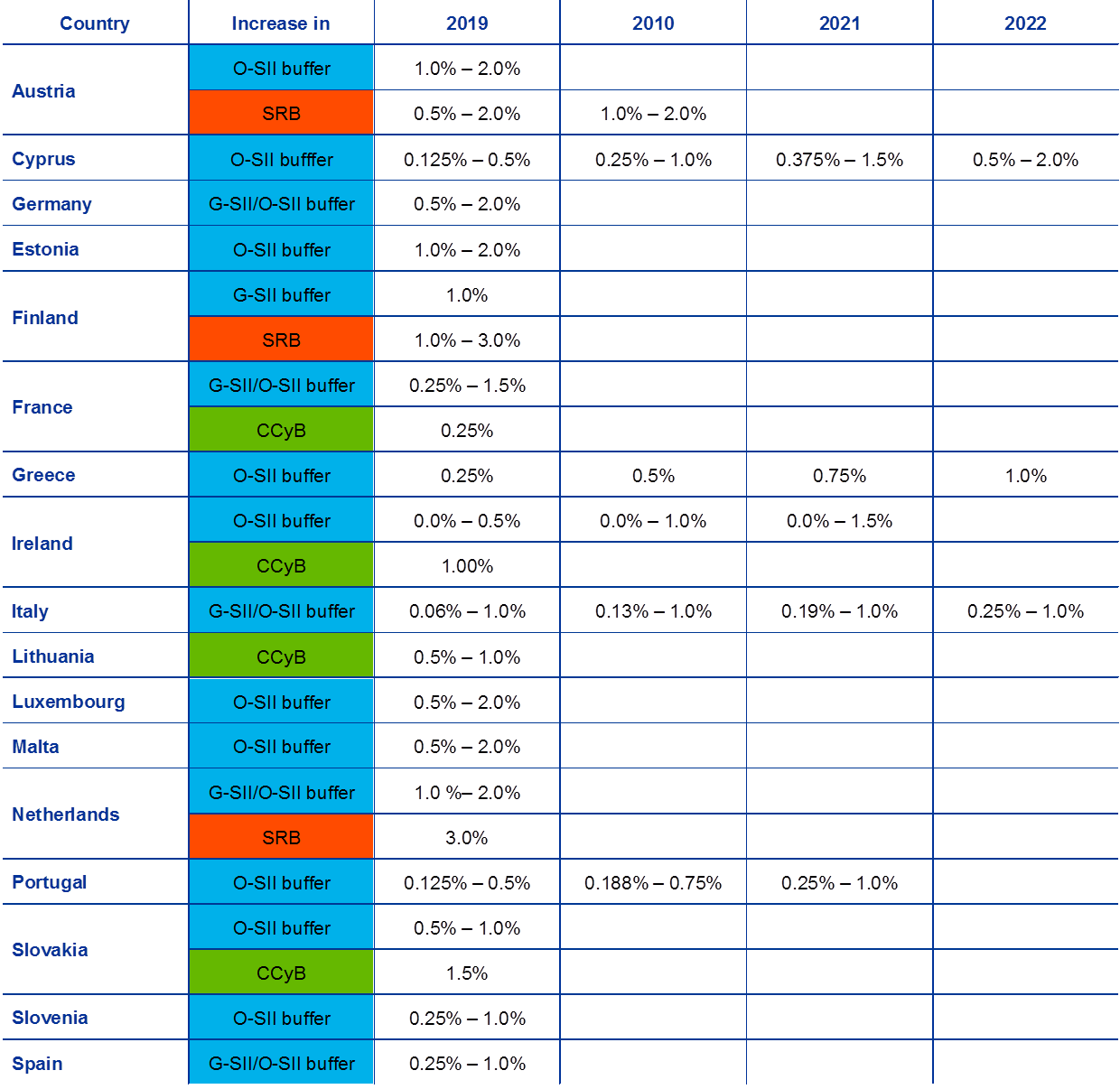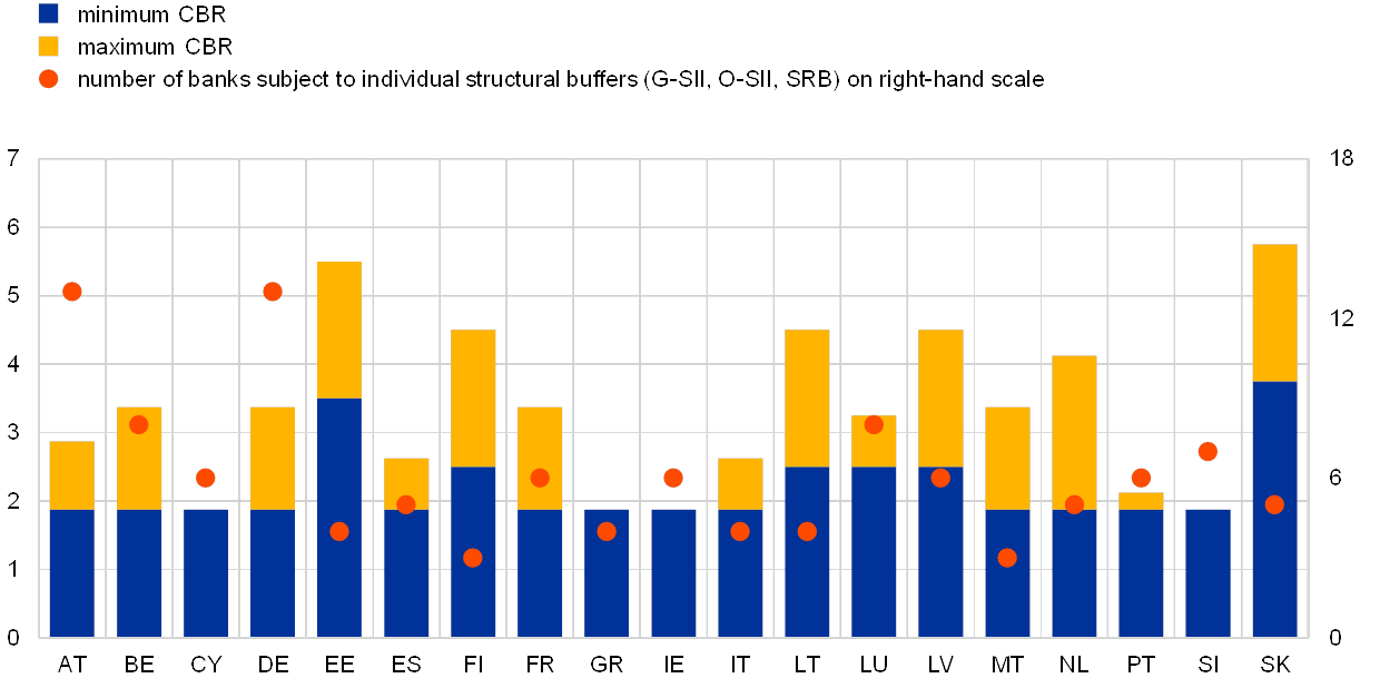 Notes: The figures only include information on supervised banks (e.g. excluding O-SII buffer requirements for investment firms in Cyprus). In some countries, certain financial institutions are designated as O-SIIs, but no additional buffer requirement applies at this time. Small and medium-sized investment firms are exempted from the CCyB and/or the CCoB in Italy, Lithuania, Luxembourg, Malta and Slovakia. For Estonia and Slovakia, the SRB is only applied to domestic exposures, meaning that the buffer applies in addition to the O-SII or G-SII buffer, whichever is greater. The combined buffer requirement is calculated in accordance with Article 131 of CRD IV, but excludes mandatory or voluntary reciprocity of foreign macroprudential measures in accordance with Recommendation ESRB/2015/2. It consists of CET1 capital and comes in addition to a minimum requirement of 8% total capital (4.5% CET1 + 1.5% AT1 + 2% T2). Pillar 2 measures are not included. The minimum combined buffer requirement at the country level corresponds to a bank not subject to any individual bank-level structural buffer (G-SII buffer, O-SII buffer or SRB). The abbreviations used in the tables, figures and notes in this section are as follows: AT1 – Additional Tier 1; CBR – combined buffer requirement; CCoB – capital conservation buffer; CCyB – countercyclical capital buffer; CET1 – Common Equity Tier 1; CRD IV – Capital Requirements Directive IV; G-SII – global systemically important institution; O-SII – other systemically important institution; SRB – systemic risk buffer; T2 – Tier 2.