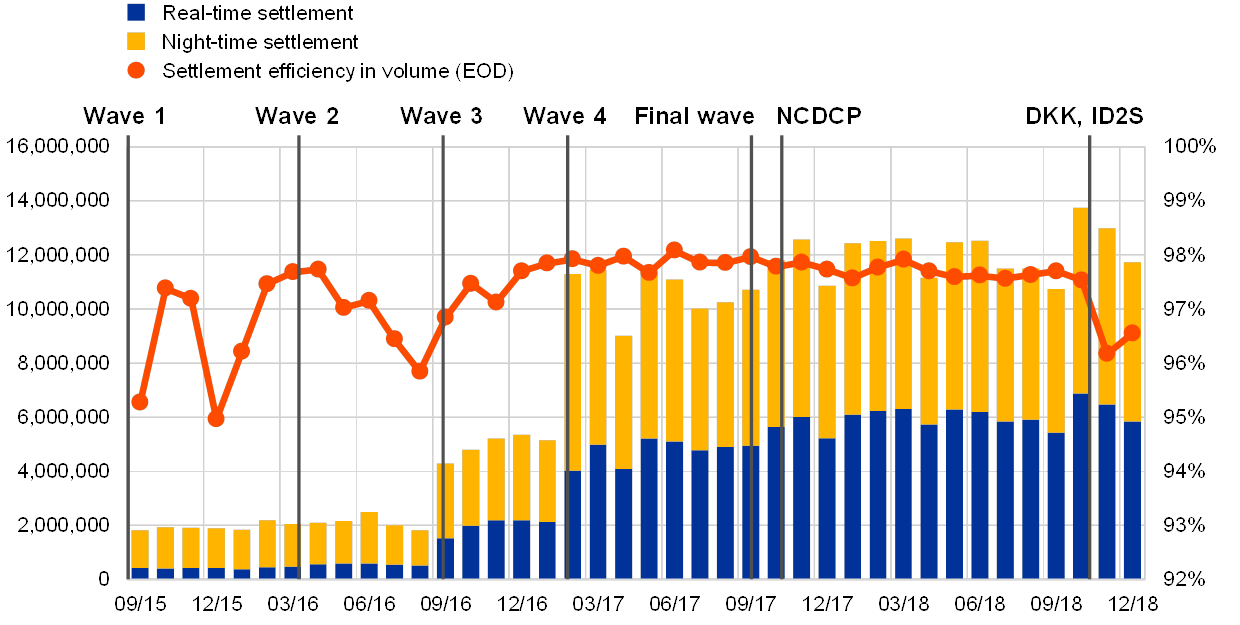 Charts 1 and 2 show the evolution of volume and value in T2S, as well as settlement efficiency, over the last four years. As illustrated, compared with 2015, the T2S average monthly volumes increased more than fivefold (543%), while the average monthly value almost doubled (88%). Settlement efficiency stabilised both in volume and in value terms, ranging between 96% and 98.5% starting from the year 2017. The year 2018 was the first period of stable, but nonetheless record-high, securities transactions figures since the T2S Go-Live. Prior to 2018, the observed volatility in settlement efficiency (for volume and value) from one migration wave to another can be mostly explained by market behaviour and the adaptation of existing business models to the new platform.