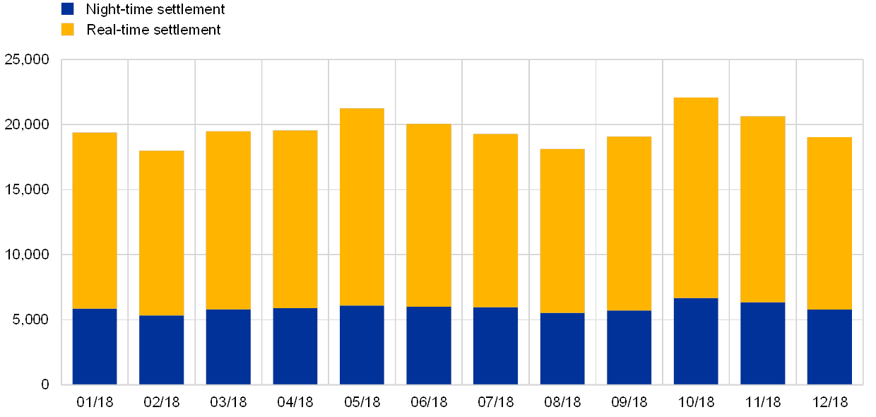 In absolute terms, the monthly value settled in NTS and RTS reached a peak in October 2018, with €6,672.64 billion and €15,407.59 billion respectively. In relative terms, the peak value settled during NTS was in July 2018 (30.95%), whereas the peak value settled during RTS was in May 2018 (71.25%).