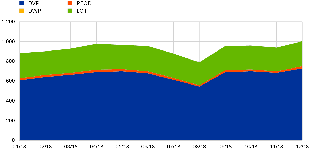 The graph shows the daily average value of DVP transactions ranging between a minimum of €544.20 billion (August 2018) and a maximum of €728.23 billion (December 2018) and the daily average value of LQT transactions ranging between €231.40 billion (August 2018) and €262.12 billion (April 2018).