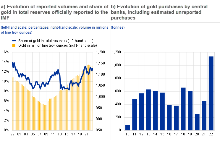 The role of gold as a reserve asset has increased in the last decade. Amounts of gold held as official reserve assets have increased steadily since the global financial crisis. Moreover, the share of gold in total reserves has risen in the past decade to reach almost 13% of total reserves in 2022, close to its 1999 peak (Chart A.2, panel a). Accumulation was mainly driven by emerging market economies, possibly as a result of low yields on major reserve currencies and, therefore, lower opportunity costs of holding unremunerated assets such as gold.[18]