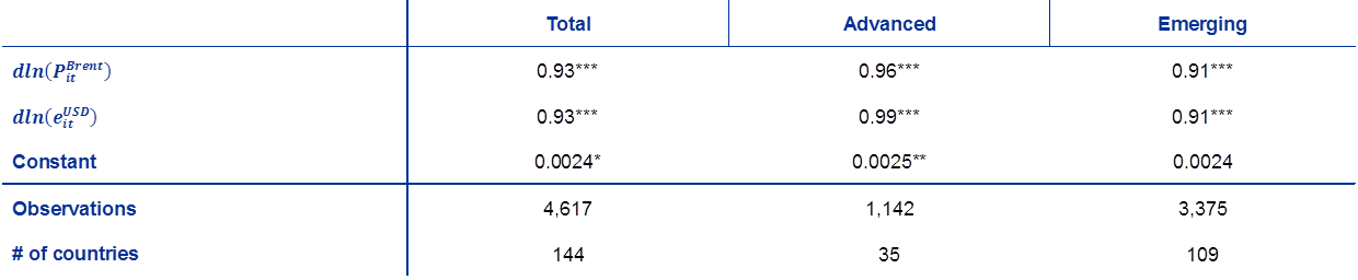 37. This is a variation of the standard pass-through regression proposed in Gopinath, G., Itskhoki, O. and Rigobon, R., “Currency Choice and Exchange Rate Pass-Through”, American Economic Review, American Economic Association, Vol. 100(1), 2010, pp. 304‑36. Data are annual and cover 144 countries over the period 1983‑2018 (we excluded the United States, OPEC and Russia from the sample as they are not typical oil importers affected by US dollar invoicing). The regression is estimated via random effects as suggested by the Hausman test. A test for serial correlation suggested that there was no autocorrelation in the residuals, hence no need to introduce lagged dependent variables in the model equation. Robustness checks have been performed introducing lags to the dependent variable. The results remained broadly unchanged.