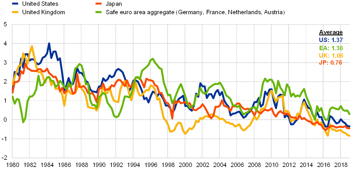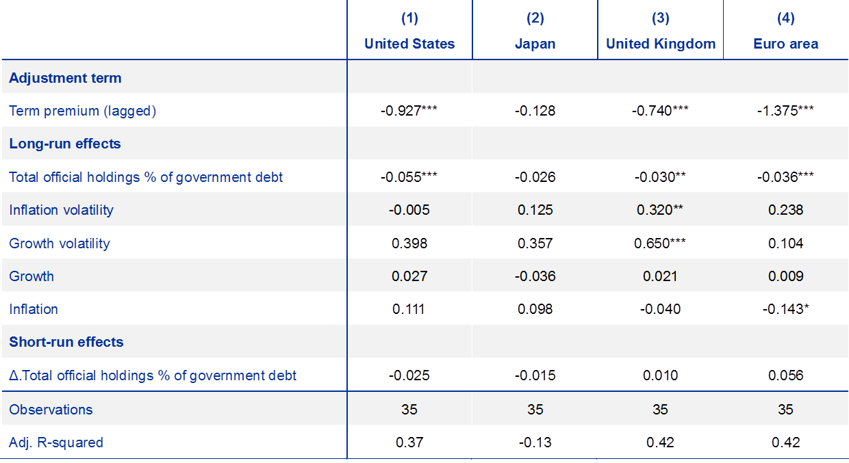 99. Fixed effect estimates are economically large and statistically significant for the United States, the euro area and the United Kingdom. For Japan, the deflation era and the persistent and large-scale asset purchases by the Bank of Japan, which made growth and inflation less volatile than in other major countries, may in part explain the persistently lower term premia.