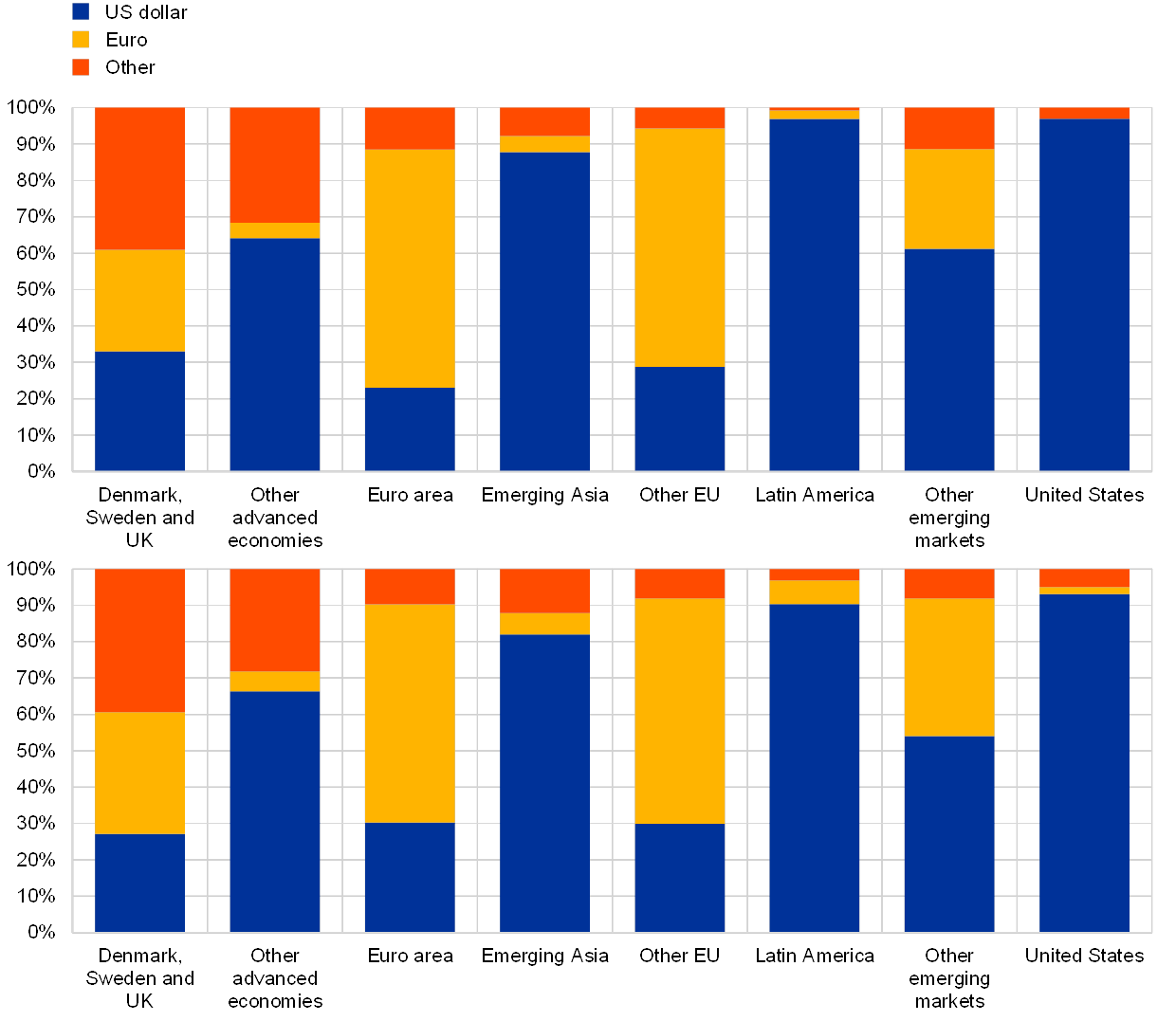 128. As banks’ cross-border asset and liability positions in US dollars tend to be vis-à-vis global rather US-based counterparts, we define the relative exposure vis-à-vis euro area and rest of the world counterparts.