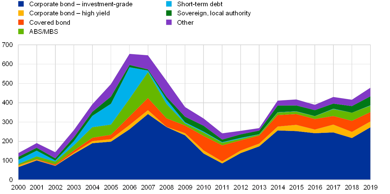 19. [19]For instance, US dollar-denominated issuance by euro area borrowers fell by 12%, to almost USD 230 billion and US dollar-denominated issuance by borrowers in other advanced economies (i.e. excluding the United States, euro area and Japan) declined by approximately 13%, to around USD 340 billion in 2019.