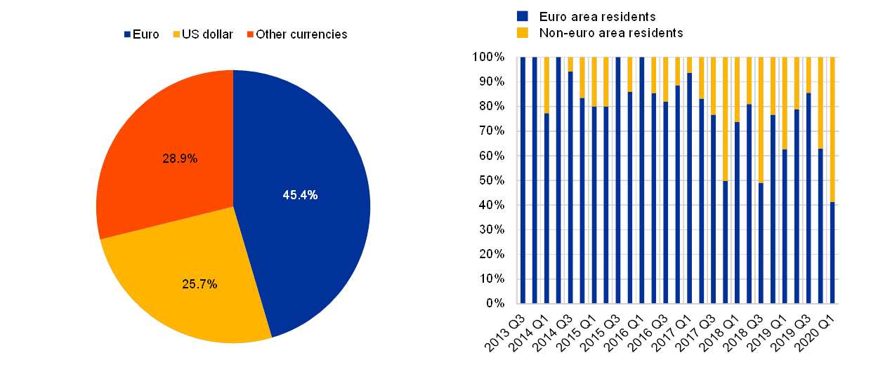Currency breakdown of green bond issuance in 2019 (left panel) and developments of the share of euro area and non-euro area issuers of green bonds in euro (right panel)