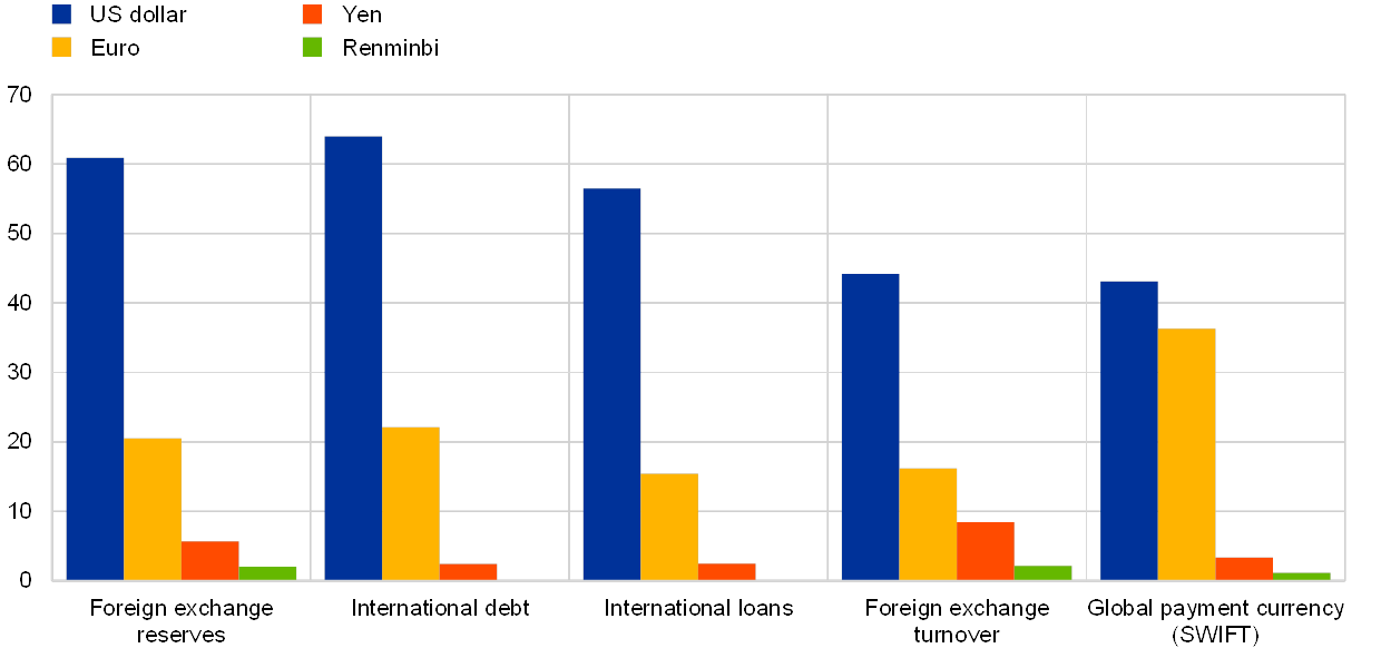 Sources: BIS and ECB calculations.Notes: As two currencies are involved in each transaction, the sum of the percentage shares of individual currencies totals 200% instead of 100%. Adjusted for local and cross-border inter-dealer double-counting (i.e. “net-net” basis).
