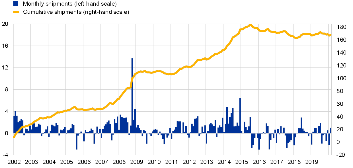 Source: Eurosystem.Notes: Net shipments are euro banknotes sent to destinations outside the euro area minus euro banknotes received from outside the euro area. The latest observation is for February 2020.