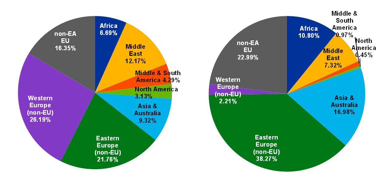Sales (exports, left panel) and purchases (imports, right panel) of euro banknotes – breakdown by destination