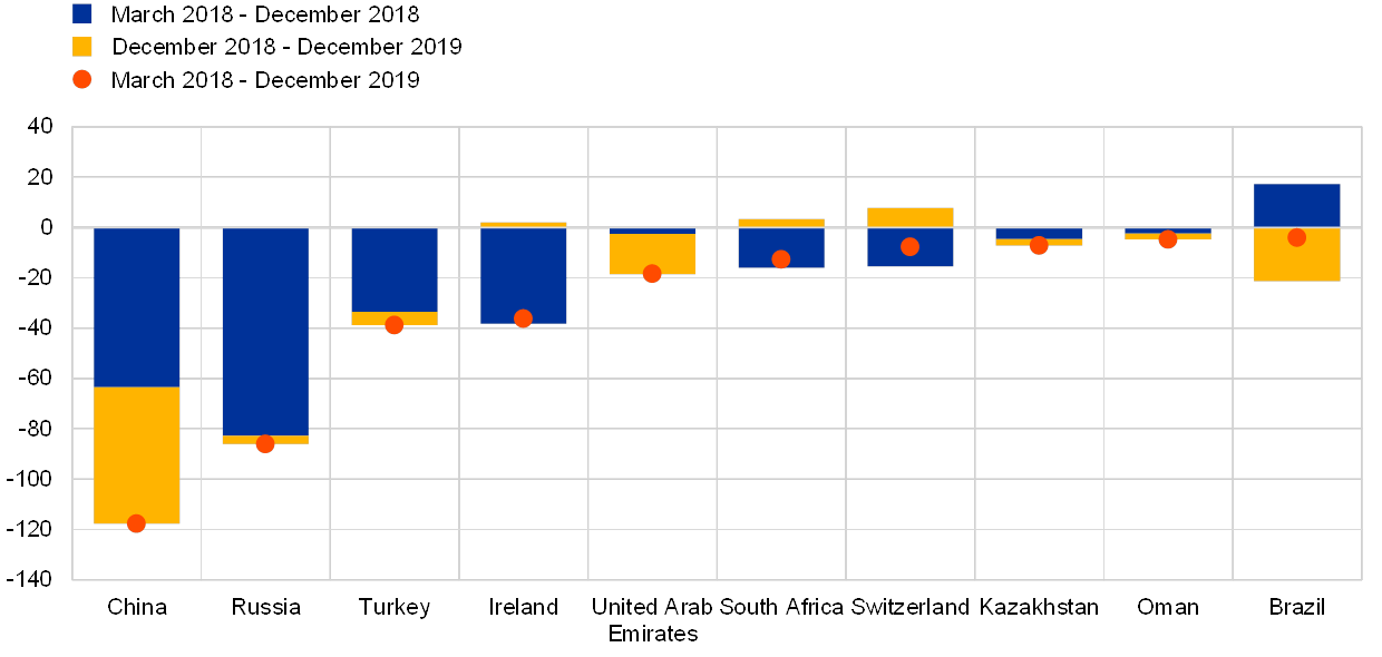 Large official reserve holders were among the main purchasers of euro-denominated assets. Motives underlying the purchases in question varied across central banks, including exchange rate management, currency diversification decisions and, in some cases, perhaps geopolitical considerations. For instance, press reports suggest that the Swiss National Bank (SNB) had been active in the foreign exchange market in order to manage the Swiss franc exchange rate as economic uncertainty raised by international trade tensions presumably led to safe haven capital inflows.[4] In line with this interpretation, holdings of euro-denominated foreign exchange reserves by the SNB increased by over EUR 20 billion in 2019. Moreover, the value of euro-denominated assets held as reserves by the Central Bank of Russia also increased by over USD 20 billion.[5] Russia had been among the main sellers of US Treasury securities between March and December 2018 in an attempt to rebalance the currency composition of its official reserves (see Chart 5). Together China and Russia sold a combined USD 204 billion worth of US Treasury debt securities amid concerns about unilateral sanctions and international trade tensions in 2018. China continued to sell US Treasury securities in 2019, to the tune of USD 54 billion. By contrast, Russia’s sales were limited in 2019, at just over USD 3 billion, having already disposed of the majority of its holdings.[6] These developments notwithstanding, US Treasury securities remained attractive safe assets globally. Several countries increased their exposures to US Treasury securities in 2019, such as Japan and some euro area countries.