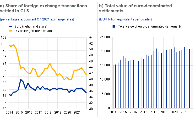 International issuance of green bonds denominated in euro almost doubled in volume to €41 billion in 2021. However, the share of the euro in this market segment declined by 5 percentage points, to around 30%, amid strong issuance of green bonds denominated in the US dollar and other currencies. The share of the euro in foreign exchange settlements at constant exchange rates declined by 1.4 percentage points, to about 36%.[1] Finally, net shipments of banknotes also declined significantly in 2021, by around 6 percentage points, possibly reflecting, inter alia, the lingering effects of the pandemic on tourism and migrant workers’ remittances.