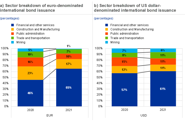 The share of the euro increased markedly in international bond issuance, in outstanding international loans and in outstanding international deposits. The share of the euro in international bond issuance increased by almost 3 percentage points, from 21.8% in 2020 to 24.6% in 2021. The increase in euro-denominated bond issuance was broad-based across borrower residence. It was driven especially by strong issuance by financial and other services firms. The share of the euro in the outstanding stock of international loans increased by over 2 percentage points to 17.6% between 2020 and 2021, while the share of the euro in the outstanding stock of international deposits rose by over 1 percentage point to almost 17% over the same period, in an environment characterised by the ECB’s accommodative monetary policy stance.