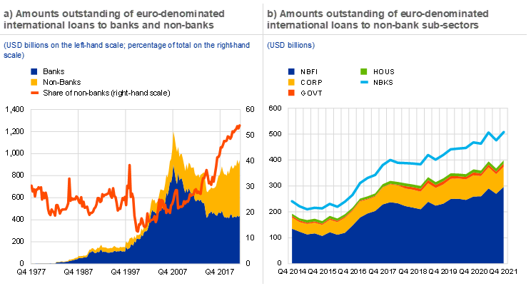 Box 3 provides insights into the international use of the euro as a financing currency across different economic sectors and the trends over time using new international locational banking statistics from the BIS. The box shows that euro-denominated international loans to non-bank financial institutions (NBFIs) have grown rapidly in recent years, and that the euro is particularly important as a financing currency for this segment of the international loan market. Given that non-banks are expected to play an increasingly strong role in the global financial system in the future, these developments might contribute to bolstering the global appeal of the euro as a financing currency in the period ahead.