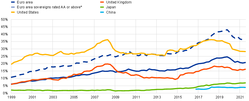 Notes: * Euro area sovereigns rated AA or above include Belgium, Germany, France, Luxembourg, the Netherlands, Austria and Finland. The latest observation is for September 2021.