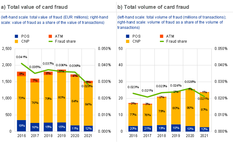 The European Central Bank (ECB) has today published its card fraud report, which is based on information provided by 20 card payment scheme operators. Card fraud in 2021 continued its downward trend, falling to its lowest level since data collection began. It constituted 0.028% of the total value of card payments made using cards issued in the Single Euro Payments Area (SEPA), amounting to €1.53 billion from a total value of €5.40 trillion. By comparison, card fraud in 2019 amounted to €1.87 billion from a total value of €5.16 trillion. The highest share of card fraud observed to date was 0.048% in 2008.