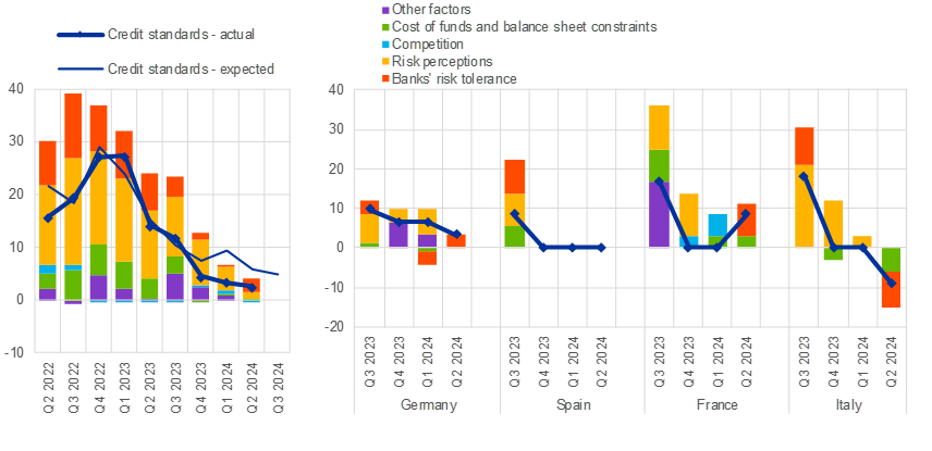 According to the July 2024 euro area bank lending survey (BLS) euro area banks reported a small further net tightening of their credit standards – i.e banks’ internal guidelines or loan approval criteria – for loans or credit lines to enterprises in the second quarter of 2024 (net percentage of banks of 3%; Chart 1). Banks reported a moderate further net easing of their credit standards for loans to households for house purchase (net percentage of -6%), whereas credit standards for consumer credit and other lending to households tightened moderately further (net percentage of 6%). This was broadly in line with the trend over recent quarters and with banks’ expectations. Banks’ risk tolerance was the main driver behind the net tightening for loans to firms. Risk perceptions were less relevant than during the rate hiking cycle, but continued to exert tightening pressure across all loan categories. Competition contributed to an easing of credit standards for housing loans. For the third quarter of 2024 banks expect a moderate net tightening for loans to firms and unchanged credit standards for loans to households.