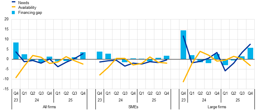 In this survey round, firms reported a modest rise in their need for bank loans (net 3%, up from 0% in the third quarter of 2025), accompanied by a small perceived decline in availability (net -2%, compared with -1% in the third quarter). This increased the bank loan financing gap – an index capturing the difference between the need for and the availability of bank loans – to net 3% (up from 1% in the previous quarter). Looking ahead, firms expect the availability of external financing to remain broadly unchanged over the next three months, which was similar to the previous survey round (Chart 2).