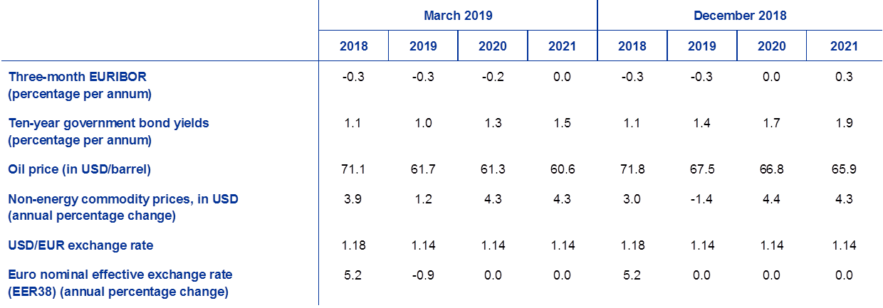 Compared with the December 2018 projections, the technical assumptions include lower oil prices, a weaker effective exchange rate of the euro and lower interest rates. The technical assumptions about interest rates and commodity prices are based on market expectations, with a cut-off date of 12 February 2019. Short-term rates refer to the three-month EURIBOR, with market expectations derived from futures rates. The methodology gives an average level for these short-term interest rates of -0.3% for 2019, -0.2% for 2020 and 0.0% for 2021. The market expectations for euro area ten-year nominal government bond yields imply an average level of 1.0% in 2019, 1.3% in 2020 and 1.5% in 2021.[2] Compared with the December 2018 projections, market expectations for short-term interest rates have been revised down by 2 basis points for 2019, 17 basis points for 2020 and 31 basis points for 2021, while long-term interest rates have been revised down by around 40 basis points over the full horizon.