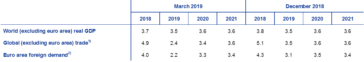 Looking further ahead, global growth is projected to pick up somewhat over the medium term. This reflects three key factors that shape the global growth path over the projection horizon. First, the cyclical momentum in advanced economies will slow as capacity constraints become increasingly binding and policy support gradually diminishes, amid positive output gaps and low unemployment rates across key advanced economies. In the United States, the boost to growth from the fiscal stimulus will peak in 2019 and the Federal Open Market Committee is likely to proceed with its gradual policy normalisation, albeit more cautiously. Second, an orderly transition to a lower growth path, less dependent on investment and exports, is expected to continue in China. Finally, growth is expected to recover in several emerging market economies that are currently going through, or have recently experienced, deep recessions. This applies especially, but not exclusively, to Argentina, Brazil and Turkey. In this regard, the projections assume that last year’s intensification of trade tensions between the United States and China weigh mainly on activity in these two countries. Overall, the pace of global expansion will settle at below pre-crisis rates and in line with potential global growth. Global growth (excluding the euro area) is projected to decline to 3.5% this year, from 3.7% in 2018, and to increase slightly to 3.6% over the period 2020-21. Compared with the December 2018 projections, the global growth projections are broadly unrevised.