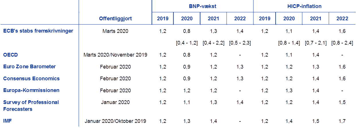 Kilder: OECD Economic Outlook, november 2019 for HICP og marts 2020 for BNP; MJEconomics for the Euro Zone Barometer, februar 2020; Consensus Economics Forecasts, februar 2020; Europa-Kommissionens økonomiske vinterprognose 2020; ECB's Survey of Professional Forecasters, 1. kvartal 2020; IMF World Economic Outlook, oktober 2019 for HICP og januar 2020 for BNP.
