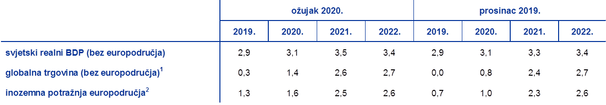 Na prijelazu iz 2019. u 2020. pojavile su se naznake stabilizacije gospodarske aktivnosti i trgovine. Podatci su u velikoj mjeri potvrdili pad globalne aktivnosti na najnižu razinu u trećem tromjesečju 2019. Dostupne informacije za četvrto tromjesečje dodatno su potvrdile da se globalna aktivnost stabilizirala na prilično niskim razinama, kao što je predviđeno projekcijama iz prosinca 2019. Međutim, pokazalo se da je rast globalnog uvoza i inozemne potražnje europodručja u drugoj polovici 2019. bio mnogo snažniji nego što je predviđeno projekcijama iz prosinca 2019., i to uglavnom zbog dinamičnog rasta uvoza u ključnim zemljama s tržištem u nastajanju, osobito u Kini i Turskoj. Podatci utemeljeni na anketama koji su bili dostupni u doba sastavljanja projekcija pružili su dodatne dokaze o spuštanju globalne gospodarske aktivnosti na najnižu razinu jer je kompozitni indeks PMI za globalnu proizvodnju (bez europodručja) u siječnju 2020. porastao, poduprt boljim pokazateljima i za sektor prerađivačke industrije i za uslužni sektor. Osim toga, sklapanje »prve faze« trgovinskog sporazuma između Sjedinjenih Američkih Država i Kine donekle je pridonijelo popuštanju trgovinskih napetosti jer su obje države snizile carine na bilateralnu trgovinu i Kina se obvezala da će u sljedeće dvije godine kupiti znatnu vrijednost robe i usluga od Sjedinjenih Američkih Država. To djelomično smirivanje situacije poduprlo je i cijene vlasničkih vrijednosnih papira, što je pridonijelo i povoljnijim uvjetima financiranja u razvijenim gospodarstvima i zemljama s tržištem u nastajanju.
